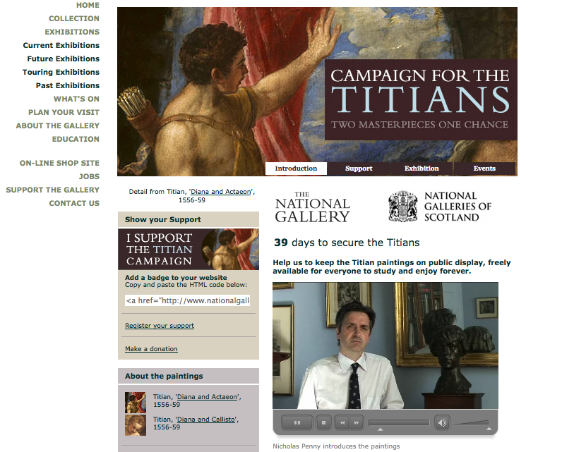 ![]() ※2008年12月31日まで、この記事をトップにします。 今、National Galleryで英国美術界を巻き込んだ大きなFundraising Campaign(寄附集め)が行われています。 The Titian Campaign ※↑画像をクリックすると、National Galleryの特設サイトに飛びます。 その渦中の作品は、16世紀ヴェネチア学派の巨匠ティツィアーノ(英語ではTitian)作の『Diana and Actaeon』↓ ![]() ※↑をクリックすると、National Galleryの作品解説サイトに行きます。さらに作品の画像をクリックすると拡大画像が見られます。 このThe Titan Campaignでは、2008年12月31日までに5000万ポンド(日本円で約7.2億円?@143円)を公的助成&民間助成で集める必要があります。もし、これが達成されないと過去約200年にわたりNational GalleryとNational Gallery of Scotlandで保有&公開されてきた傑作が国外に流出してしまう危機にあります。 そもそもの発端は、現在『Diana and Actaeon』の所有者であるDuke of Sutherlandが手放すことにしたことに始まります。今のところ、英国外の個人コレクターに売り渡されることが報じられていますが…。 8月の初めに、Duke自らNational Gallery of Scotlandに大晦日までに5000万ポンド集められれば、市場価格で6倍するところを5000万ポンドで所有権を譲り渡すと伝えました。さらに、『Diana and Actaeon』の対作である『Diana and Callisto』も3年後に同額程度でNational Gallery側に独占的に売り渡すことを示唆しています。 今までに、美術品の英国内でのコレクション充実に大きく貢献をしている財団Art Fundにより約1000万ポンドが寄附されることが決定しています。 が、なかなか思うようには集まらないようで…、おまけにこの歴史的不景気の英国経済。これが昨年であったら、かなり多くの企業が名乗りをあげたはずです。(今や2012年ロンドン五輪にまで懸念がおよぶぐらいですから…。) そんななか、ついにLucian Freud, Damien Hirst, David Hockneyら英国現代美術家20名が署名をした「申し状」を携え、この危機への措置を訴えるべく、Tracey Eminが首相官邸に赴きました。「もしこの歴史的名作が失われたら、英国政府は恥じるべきだ」と。 ![]() 私も来週にでも、わずかながらですが寄附をしてきます。Fundraisingの難しさを知っている者として、National Gallery愛用者として、少しでもこのキャンペーンについて、皆さんに知っていただけたらと思い、記事にします。 【寄附方法】 ※National Gallery特設サイトより抜粋。 Help to keep the paintings on public display in the UK by making a donation now. Every donation large and small will make a real difference. By cheque Please download and fill in the form below, send it with your cheque to: The Development Office The National Gallery FREEPOST LON8962 LONDON WC2N 5BR Download donation form (PDF 58kb) Leave a donation at the Gallery Please visit the information desks in the foyers of the National Gallery. Staff can take your cash or cheque donation and give you a receipt. Online You can also make a donation online on the Just Giving website. Contact us If you would like to contact the development department please call 020 7747 5875 or email development@ng-london.org.uk Please Note: In the event that the National Gallery is unsuccessful in raising sufficient funds to purchase Titian’s 'Diana and Actaeon', this donation will be used to save other masterpieces. 【関連ニュース記事】 Tracey Emin says Government faces embarrassment if Titian paintings are lost The artist Tracey Emin has said that the Government faces embarrassment if two paintings by Renaissance master Titian are lost to foreign buyers. By Telegraph Reporter Last Updated: 11:01PM GMT 10 Nov 2008 Emin delivers petition for Titian The artist Tracey Emin visited Downing Street yesterday to deliver a letter signed by Lucian Freud, Antony Gormley, David Hockney and 37 other artists. By Arifa Akbar, arts correspondent, Independent Tuesday, 11 November 2008 ![]() |